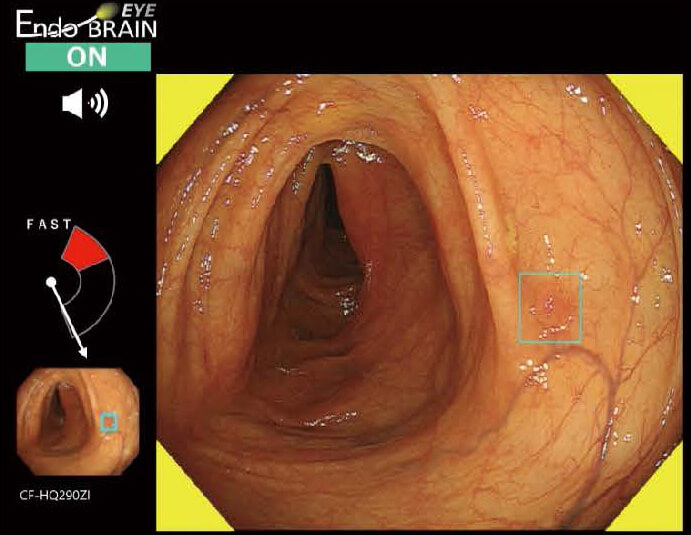 肛門から内視鏡を挿入し、大腸と小腸の一部を観察・検査します。炎症や潰瘍、ポリープ、がんなどの有無を調べることができます。 大腸内視鏡検査中の画像をAIが解析し、ポリープ・がんなどの病変候補を検出するとリアルタイムに音と画面上の色で警告し、検出位置を枠で表示します。